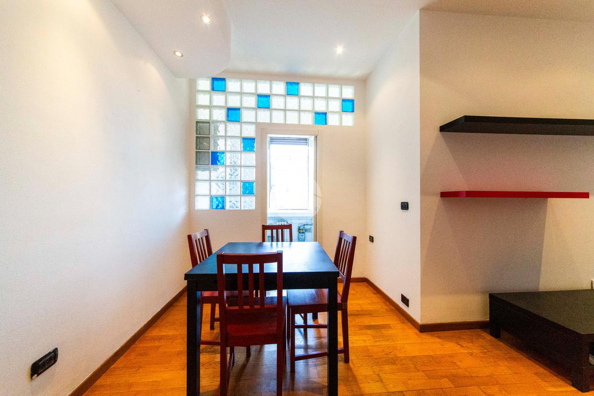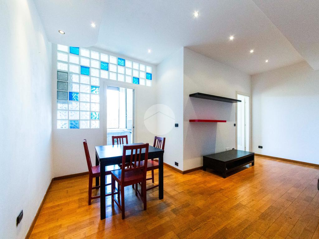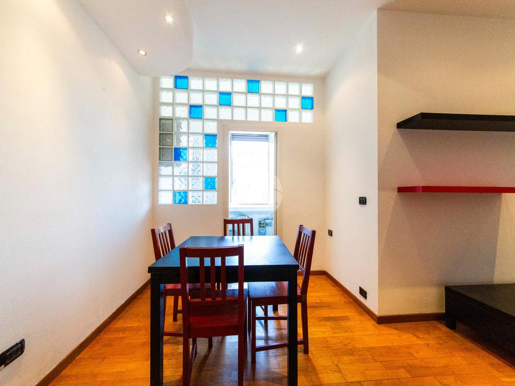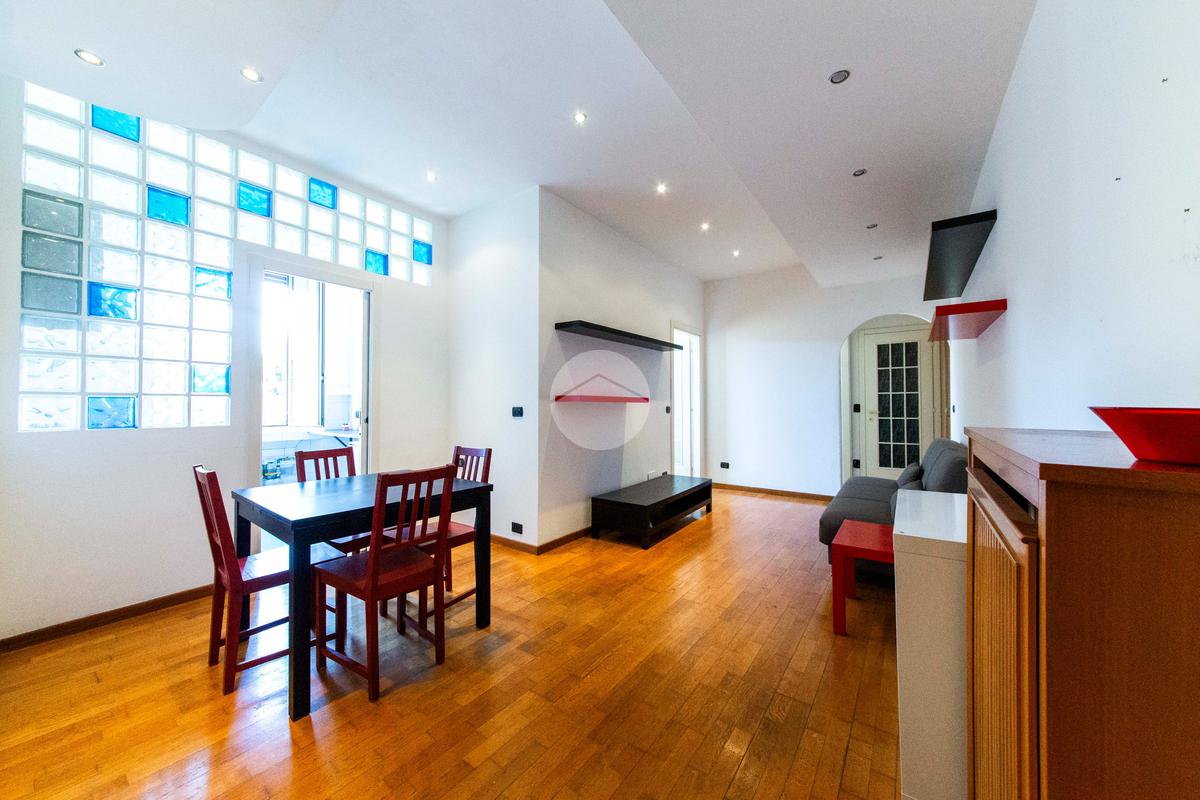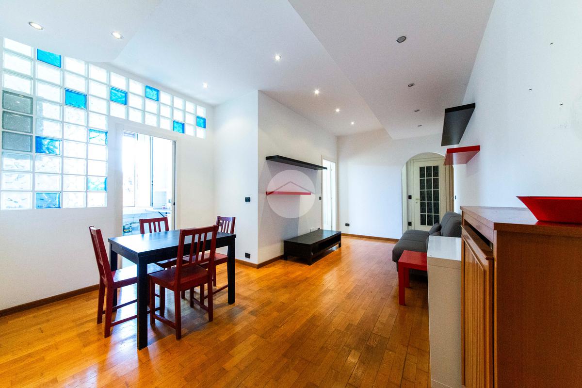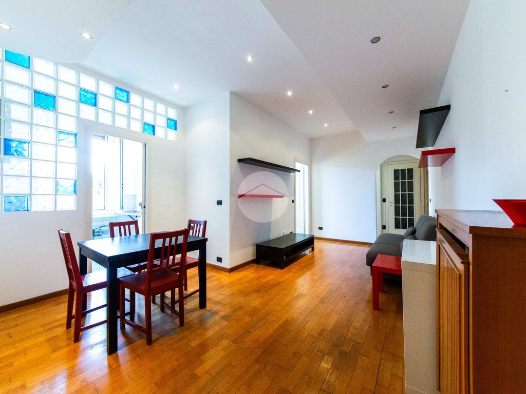 Ingresso che si apre direttamente sull'ampia e luminosa zona living, con cucina separata e piacevole affaccio sul cortile interno.