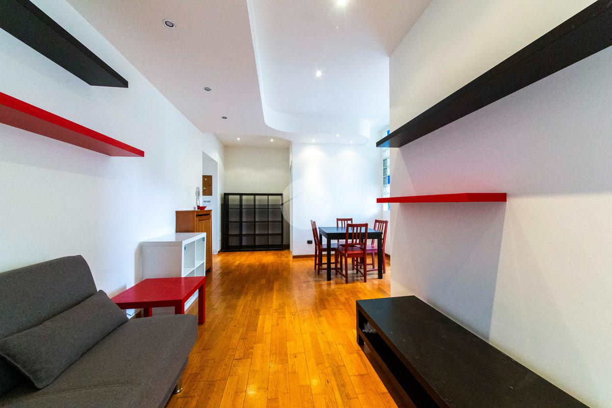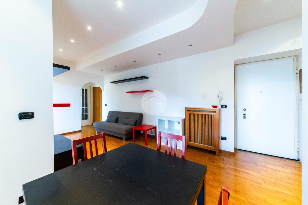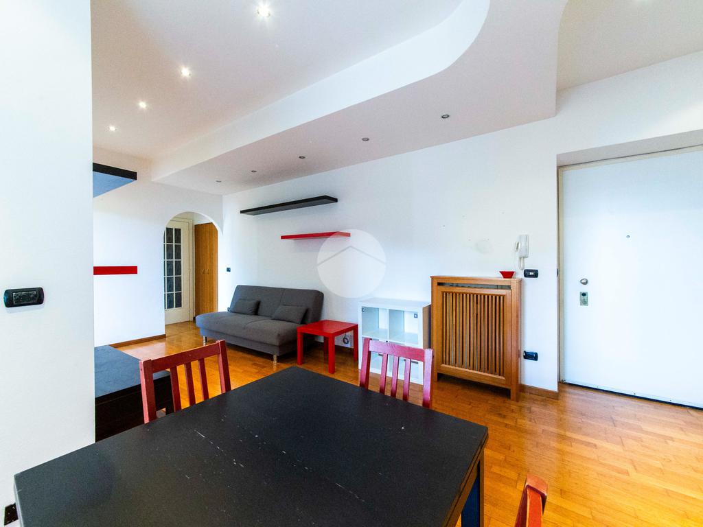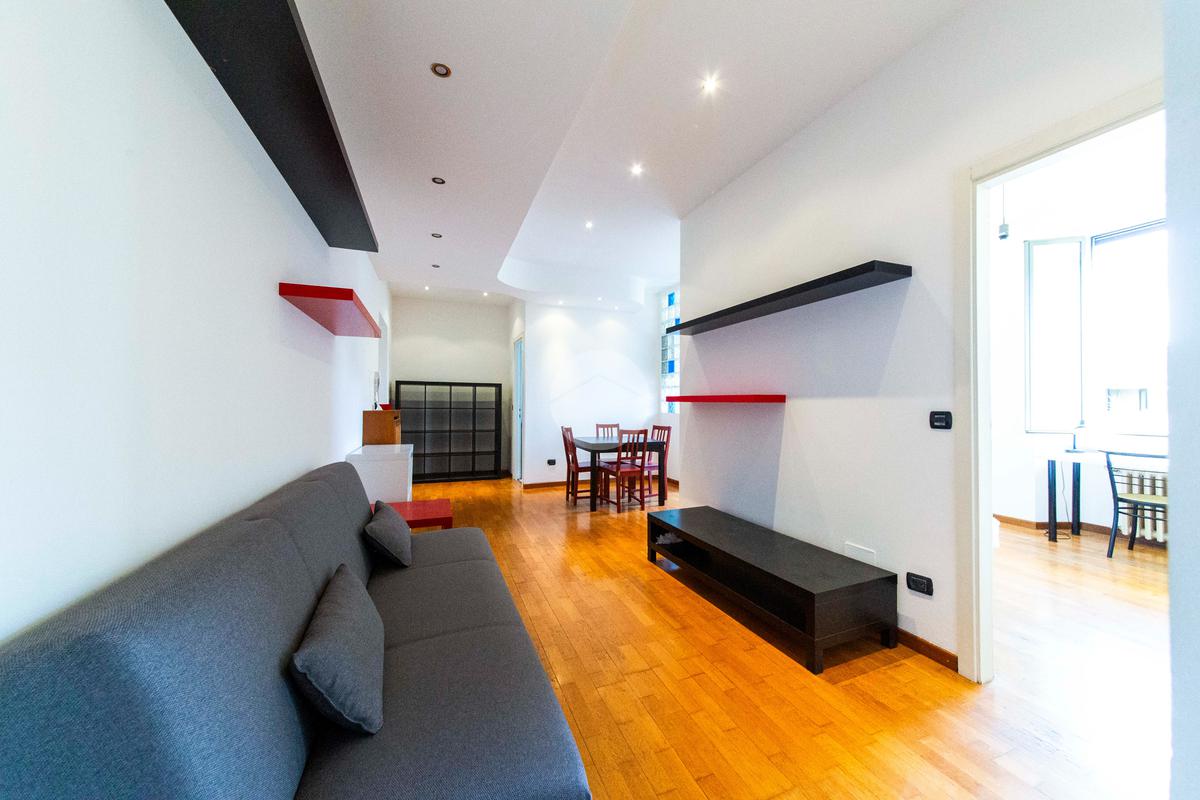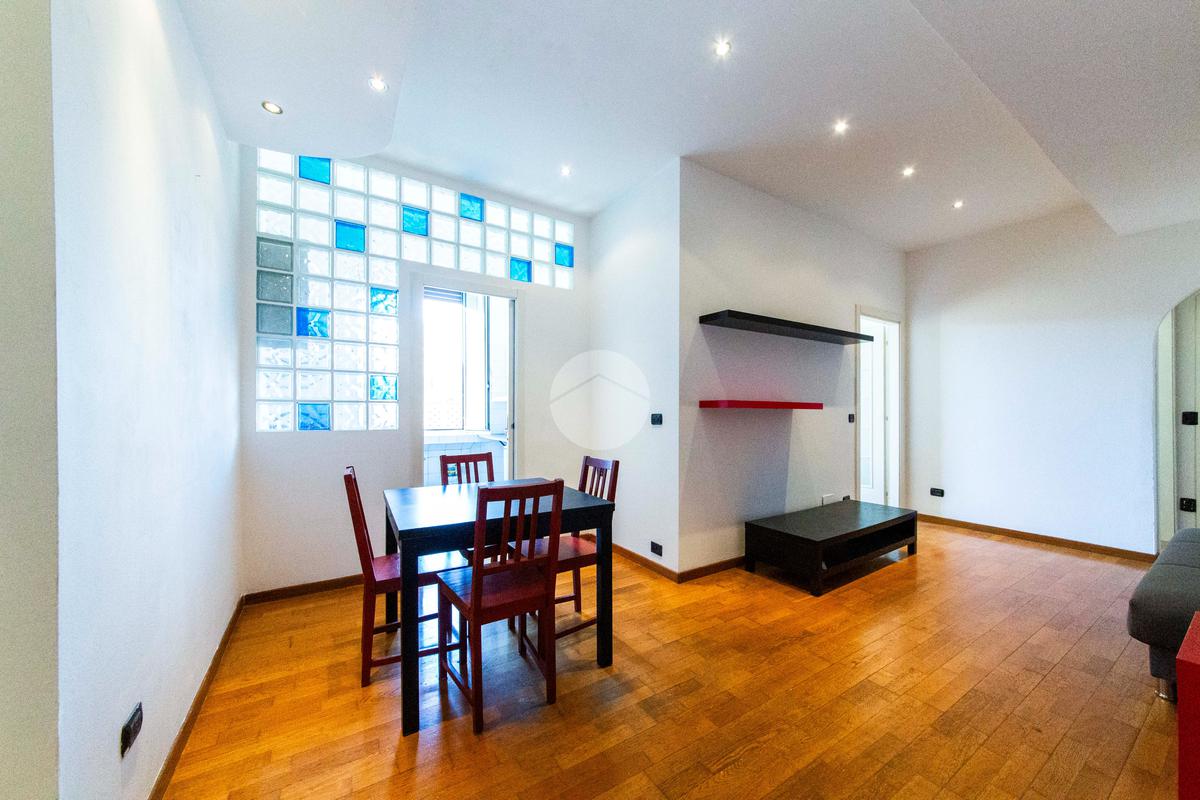 Ingresso che si apre direttamente sull'ampia e luminosa zona living, con cucina separata e piacevole affaccio sul cortile interno.