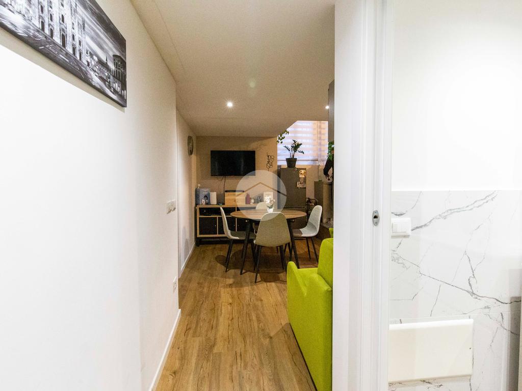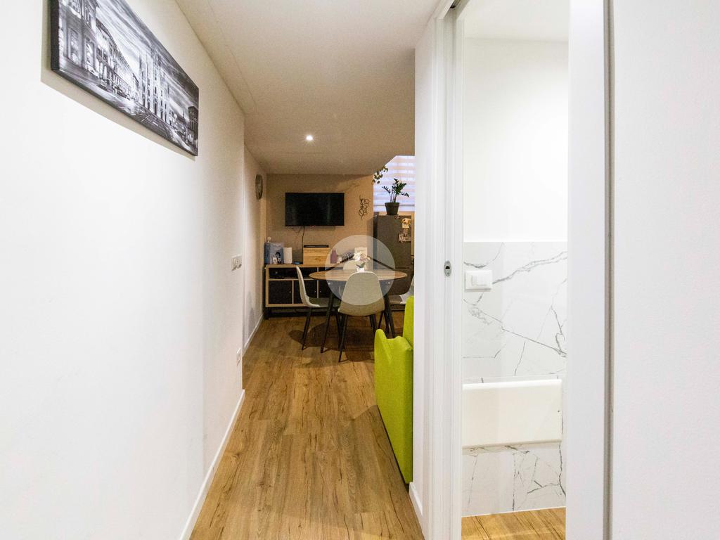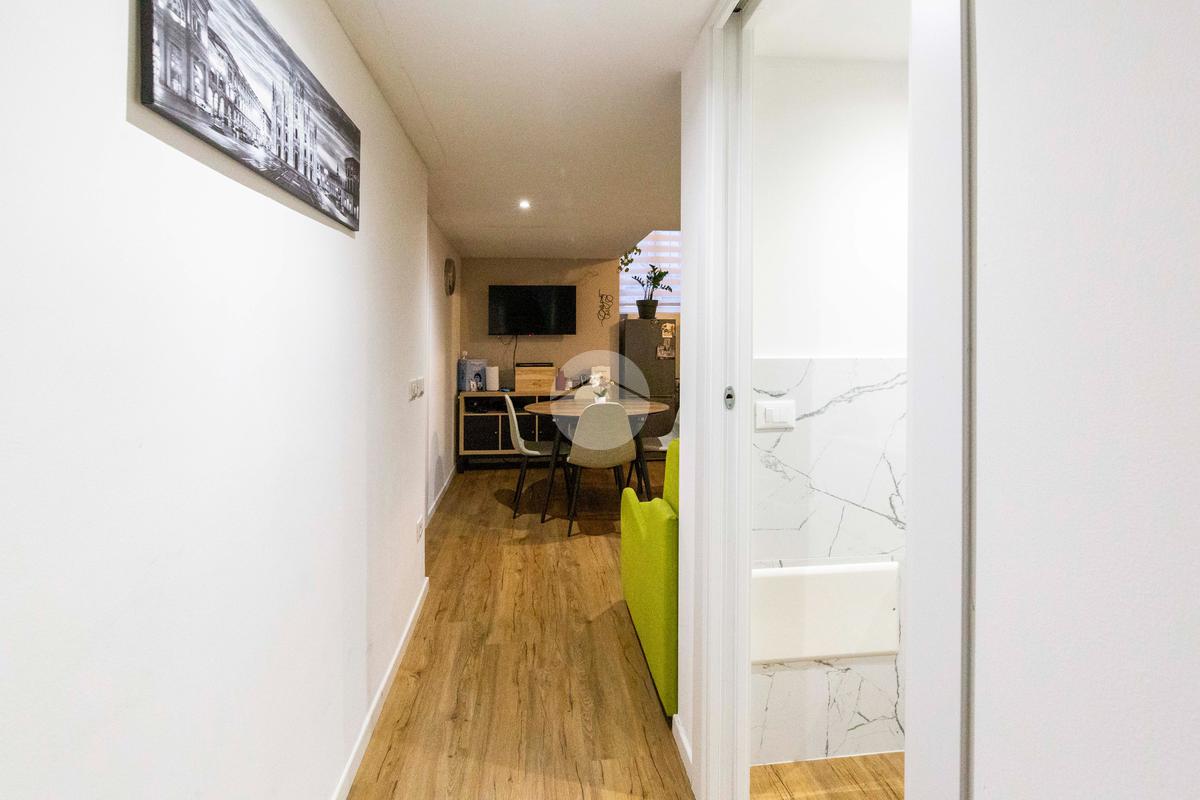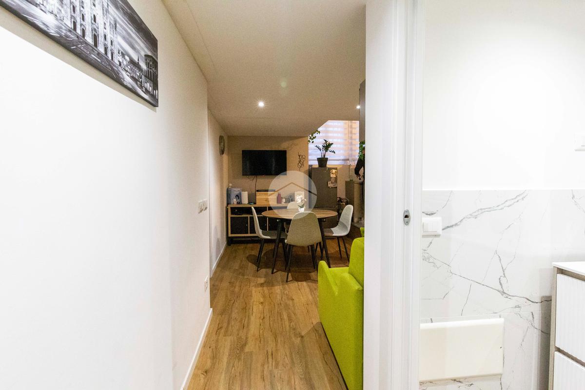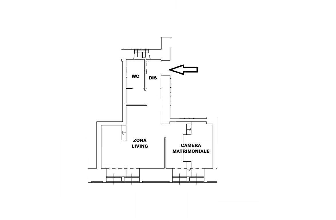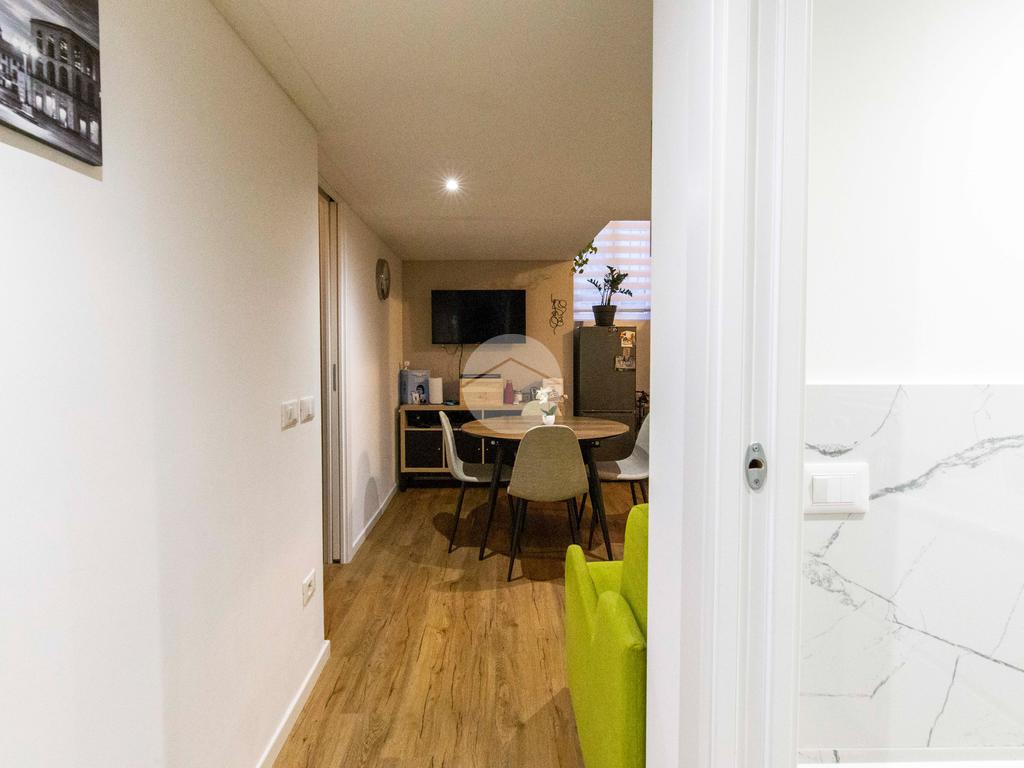 Ingresso in disimpegno, dal quale si accede ai vari ambienti della casa e dove subito sulla sinistra troviamo l'ampia zona living con cucina a vista, caratterizzata da un doppio punto luce che offre un piacevole affaccio su Via Plana.