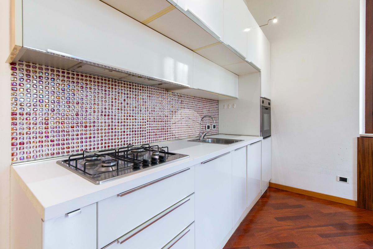 L’ingresso si apre su un comodo disimpegno che conduce, sulla destra, a un’ampia camera matrimoniale con piacevole affaccio sul cortile condominiale. Segue la zona living, caratterizzata da una doppia esposizione angolare, che offre un ambiente luminoso con cucina a vista e affaccio su un’ulteriore porzione del cortile. Proseguendo lungo il disimpegno, e con la medesima esposizione, si accede al bagno finestrato, completo di box doccia, e infine alla seconda camera.